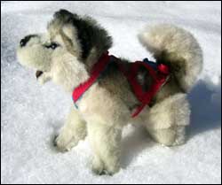 Naturgetreuer Husky aus Plüsch, schön verarbeitet, mit rotem x-back Zuggeschirr